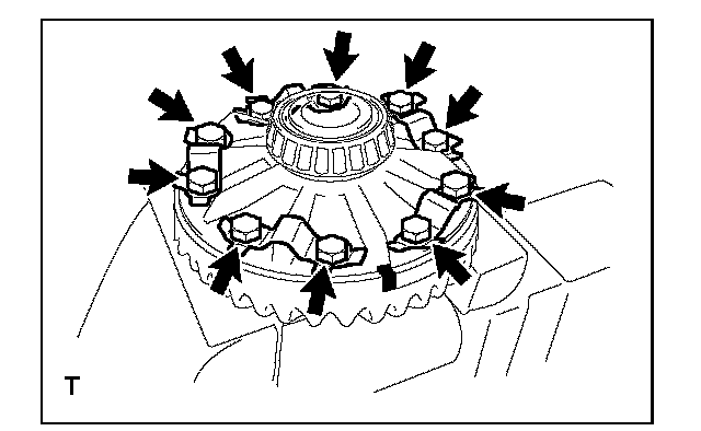 (4) Remove 10 bolts and 5 lock plates from the differential case.