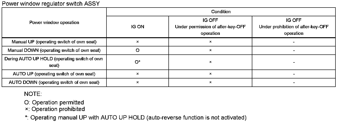 1. If any malfunction occurs on the pulse sensor for the auto-reverse function trigger, or any irregularity exists on window position or learned value, the following power window operations are prohibited.
