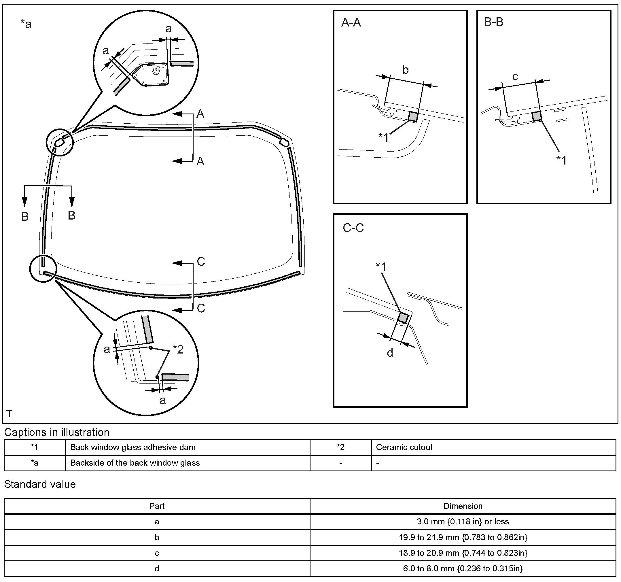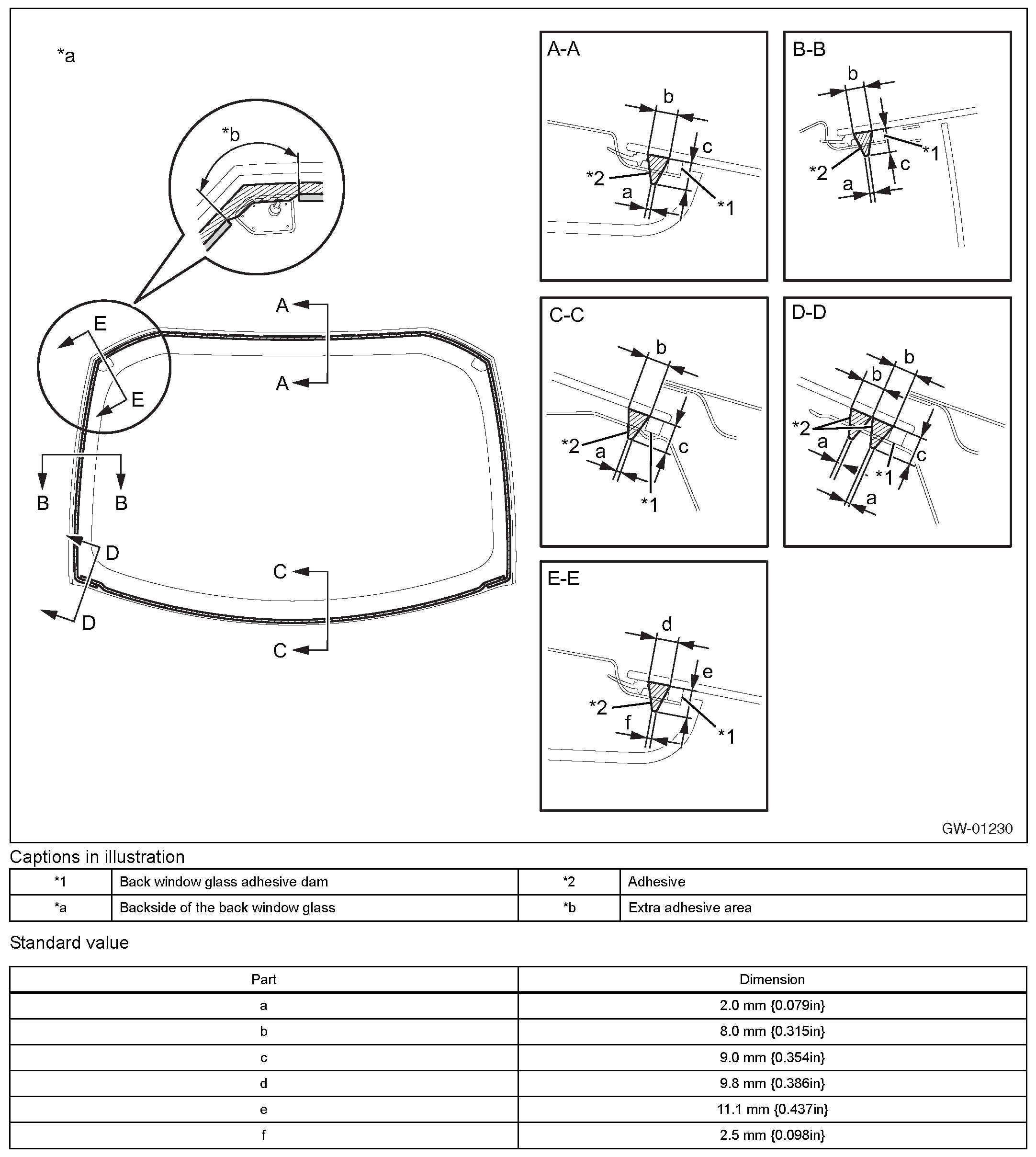 b. Temporarily place the back window glass on the body, and set it so that the upper and side sections for the back window glass become equal in width (consistent clearance between body and back window glass edge).