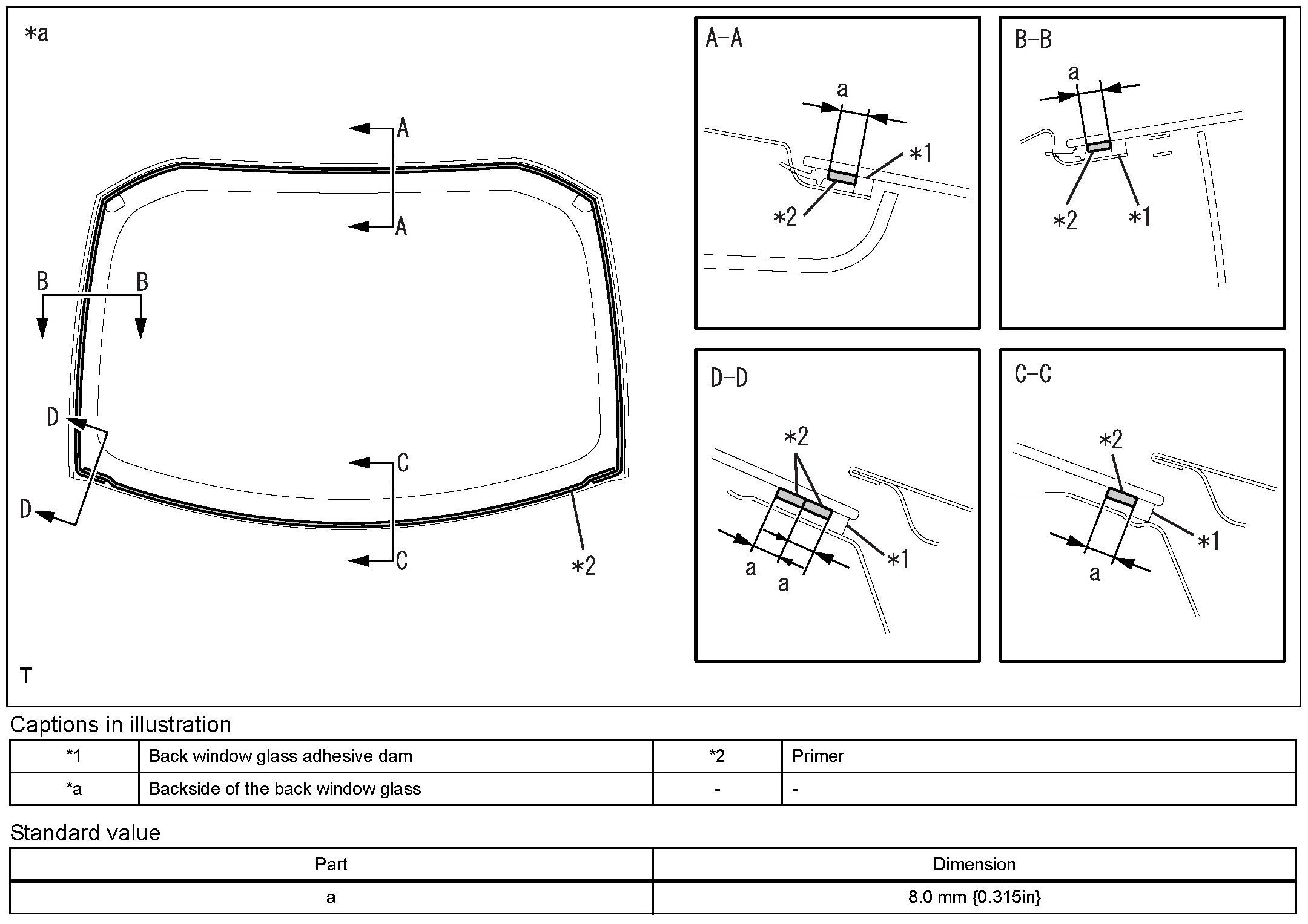 2. Attach new back window glass adhesive dam onto the place of backside of the back window glass where indicated in the figure.