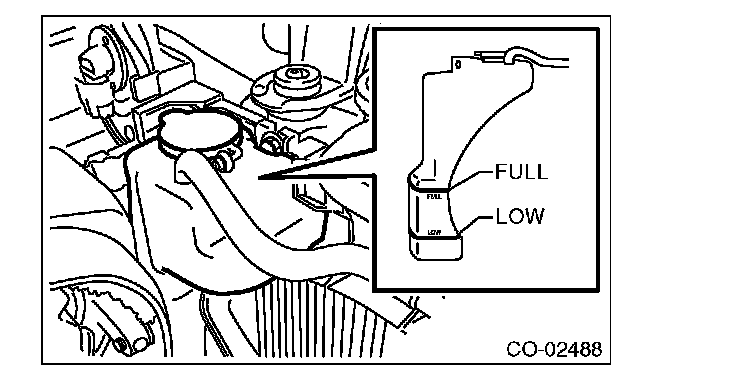 11) Open the coolant filler tank cap. If the engine coolant level drops, add engine coolant into the coolant filler tank up to the filler neck position and the reservoir tank to "FULL" level.