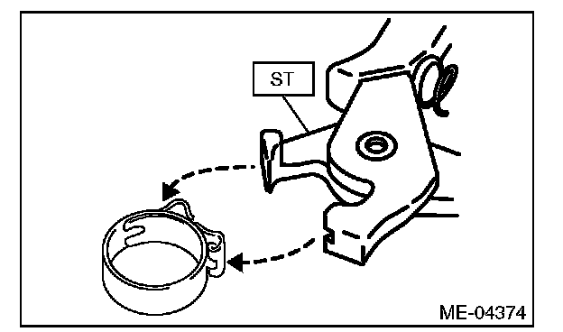 Pinch the clamp of the water tank pipe assembly by fitting the cut out in the ST with the protrusion on the clamp as shown in the figure, and unlock the clamp.