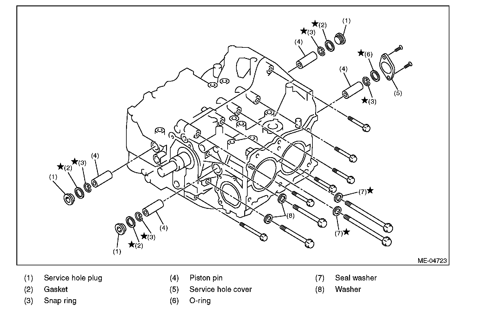 26) Rotate the crankshaft to bring #1 and #2 pistons to bottom dead center position, then remove the piston snap ring through service hole of #1 and #2 cylinders.