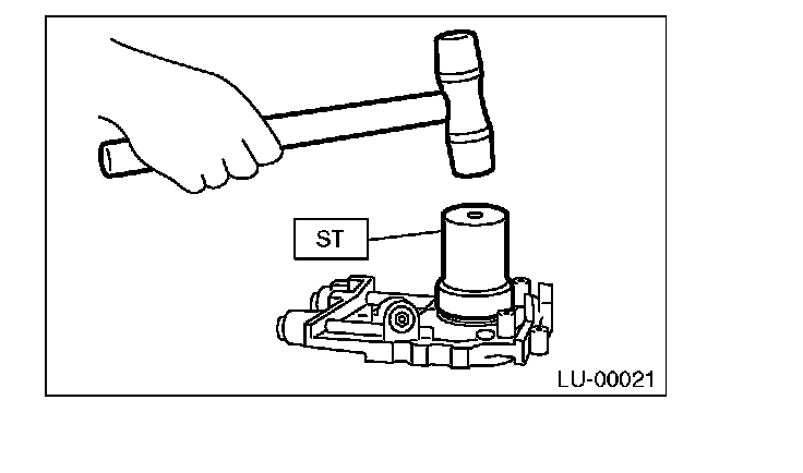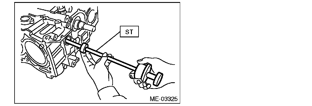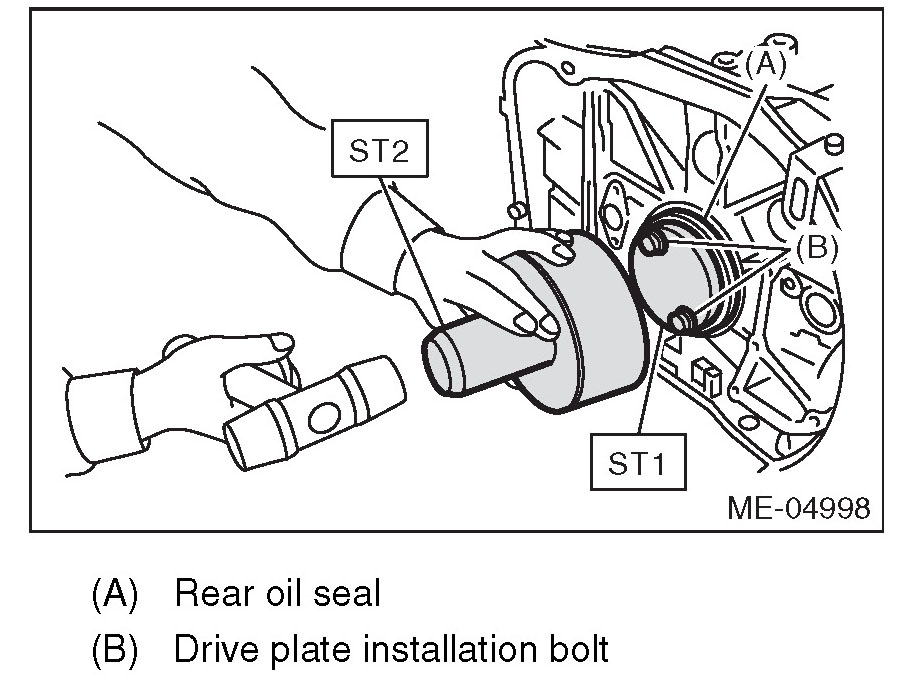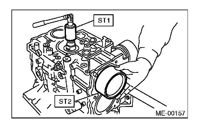 12) Apply a coat of engine oil to the oil seal inner periphery and outer periphery, and install the rear oil seal using ST1 and ST2.
