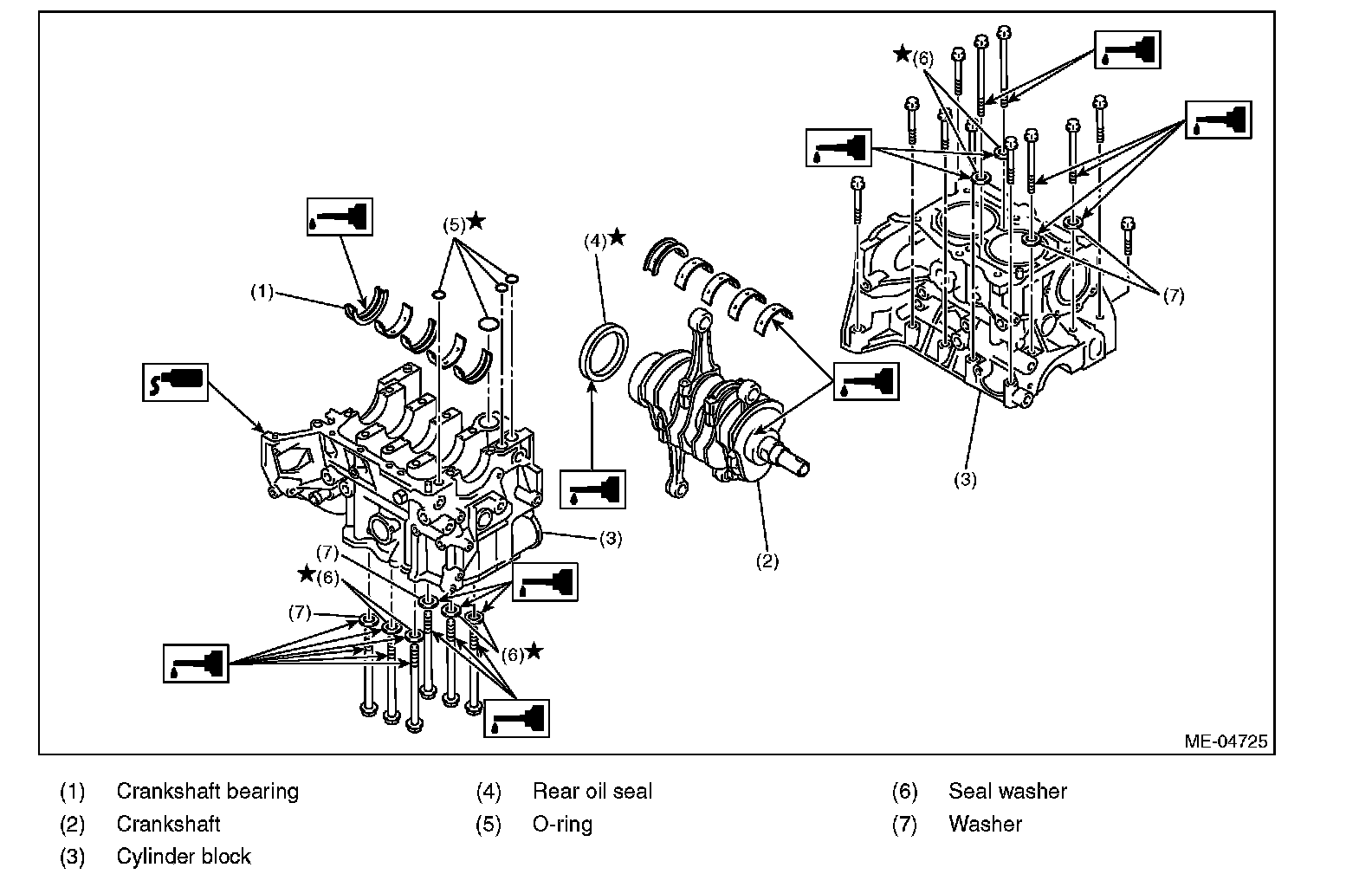 1) Remove oil on the mating surface of cylinder block before installation. Apply a coat of engine oil to the bearing and crankshaft journal.