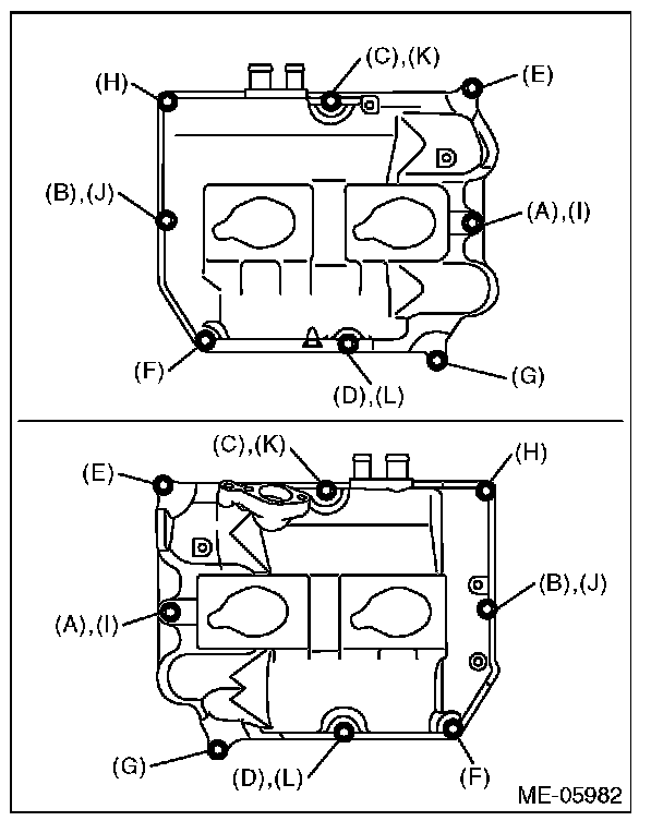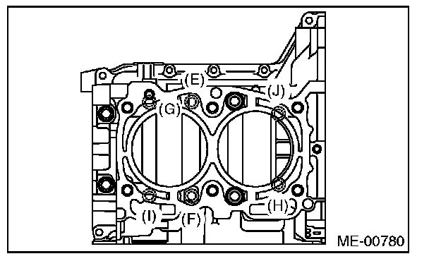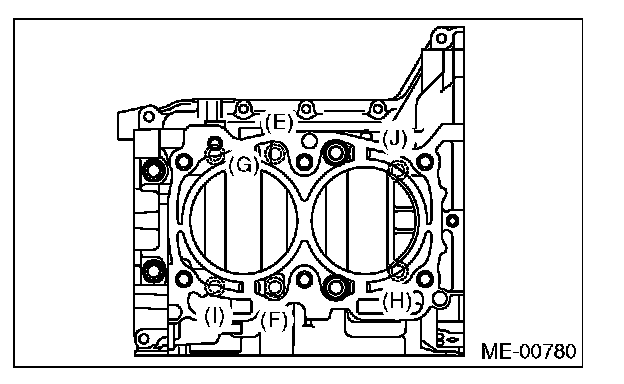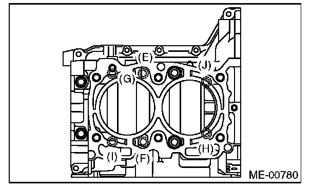 10) Tighten the RH side cylinder block connecting bolts (E - J) further in alphabetical order.