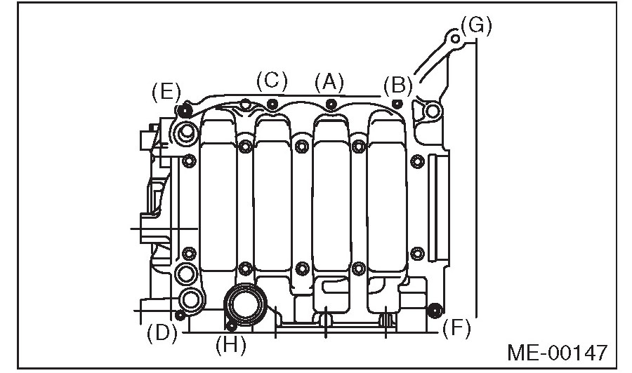 11) Tighten the 8 mm and 6 mm cylinder block connecting bolts on the LH side (A - H) in alphabetical order.