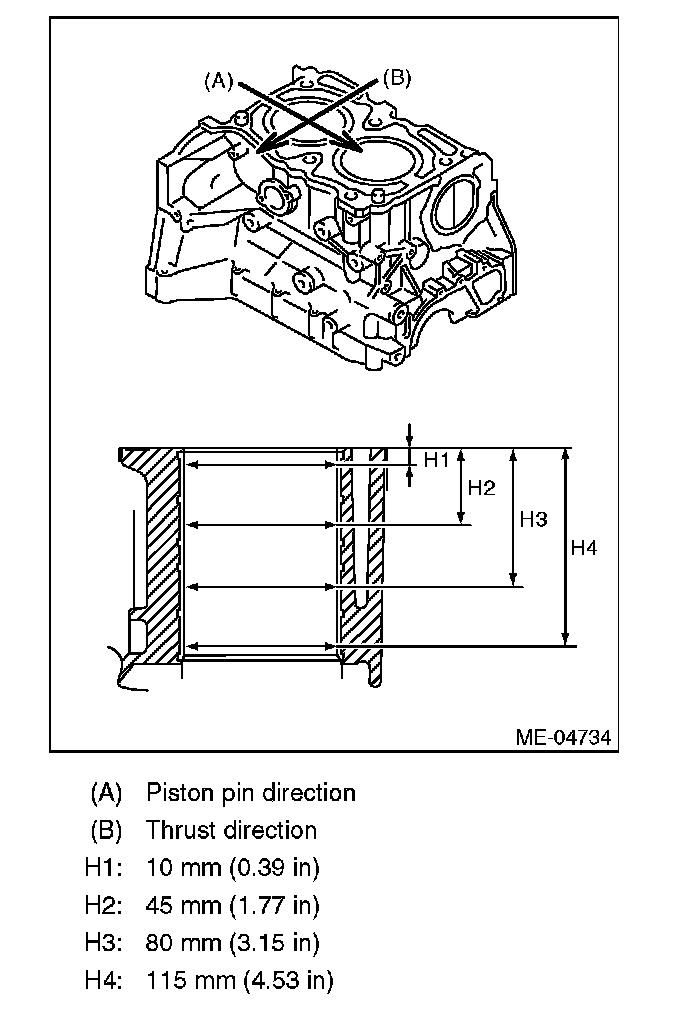 Measure the inner diameter of each cylinder in both the thrust and piston pin directions at the heights as shown in the figure, using a cylinder bore gauge.