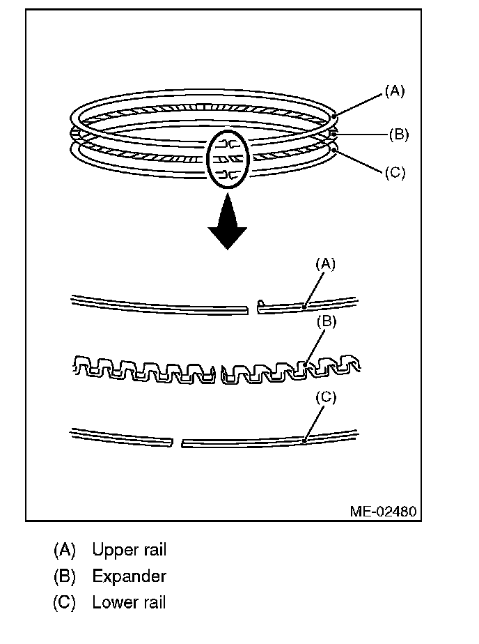 ^ Oil ring consists of the upper rail, expander and lower rail. When installing oil ring on piston, be careful of the direction of each rail.