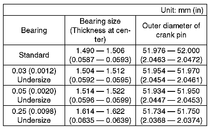 3) Inspect the crank journal and crank pin for wear. If they are not within the standard, replace the bearing with a suitable (undersize) one, and replace or grind to correct the crankshaft as necessary. When grinding the crank journal or crank pin, finish them to the specified dimensions according to the undersize bearing to be used.