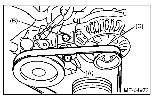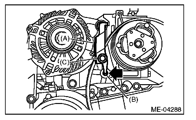 2) Install the front side belt (C), and adjust the slider bolt (B) so as to obtain the specified belt tension.