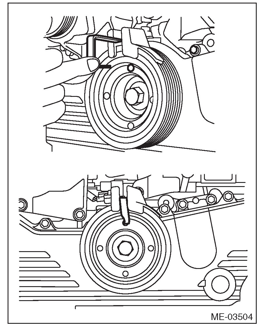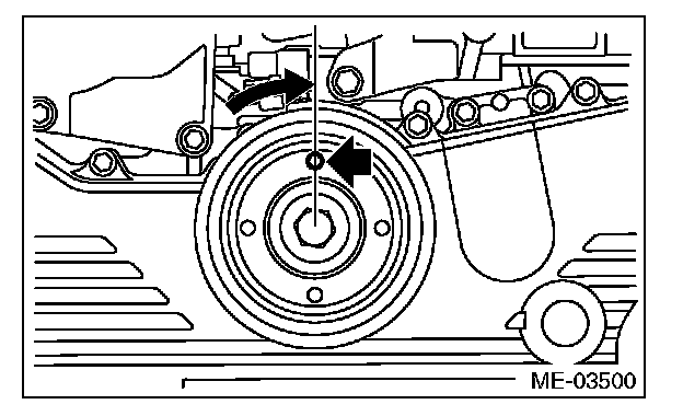3) Slowly turn the crank pulley clockwise so that the service hole of the crank pulley comes around the top.