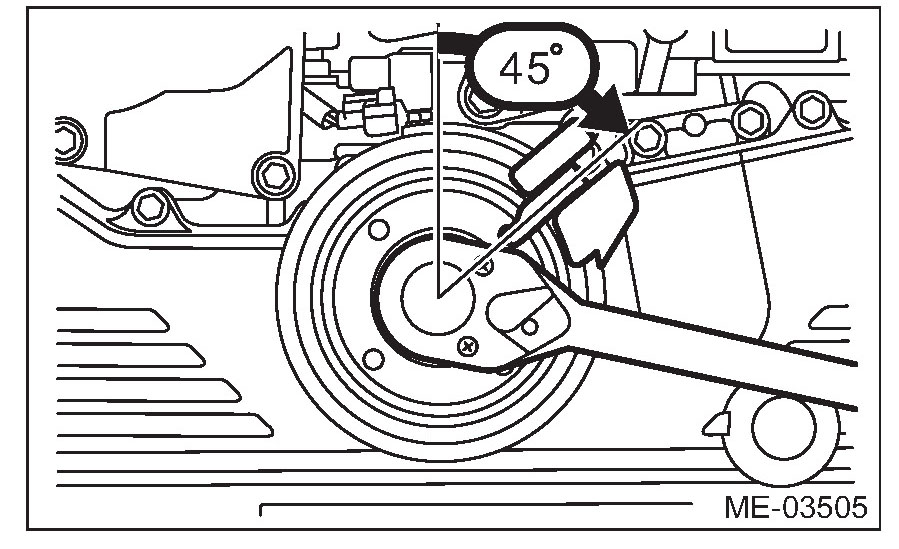 8) Slowly turn the crank pulley clockwise until the belt guide comes to approximately 45°.