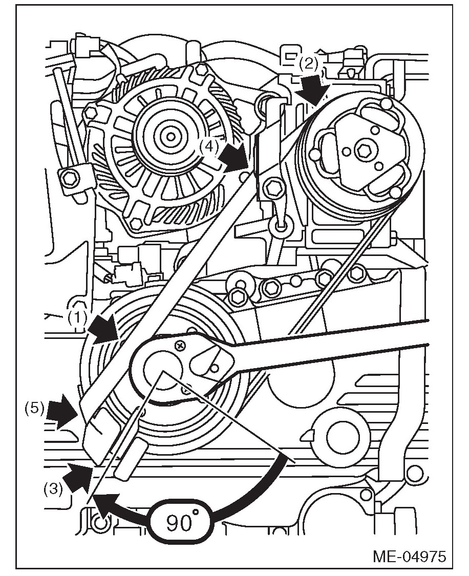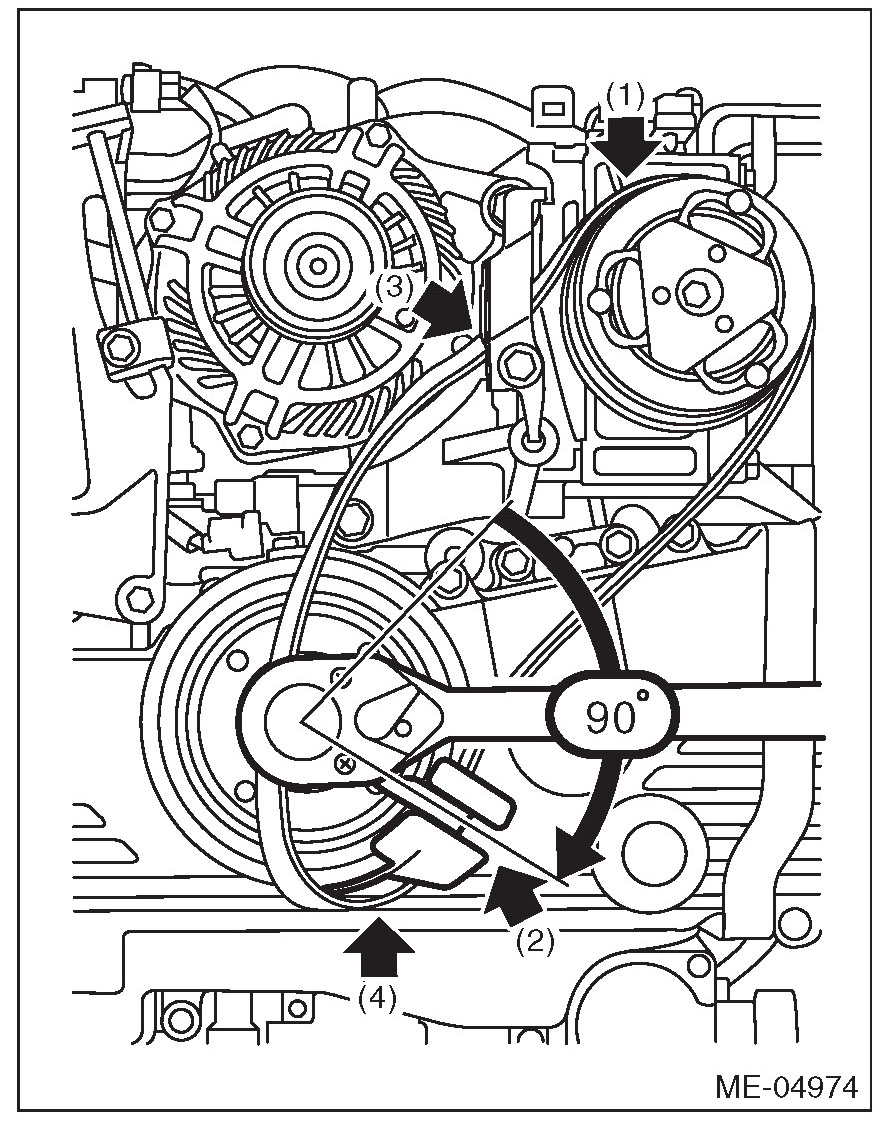 16) Make sure that the belt rib is securely installed on the groove of each pulley, then turn the crank pulley slowly, twice in the clockwise direction, to seat the rear side belt properly.