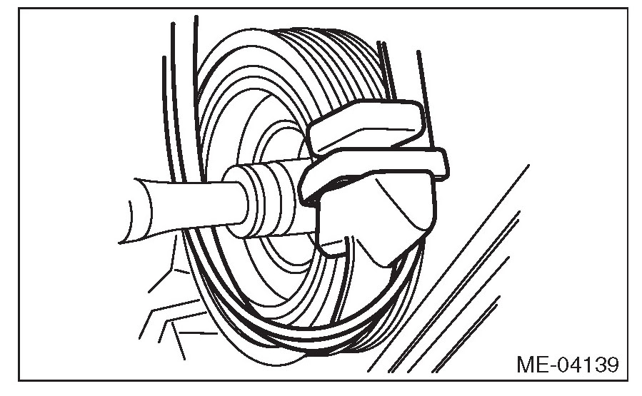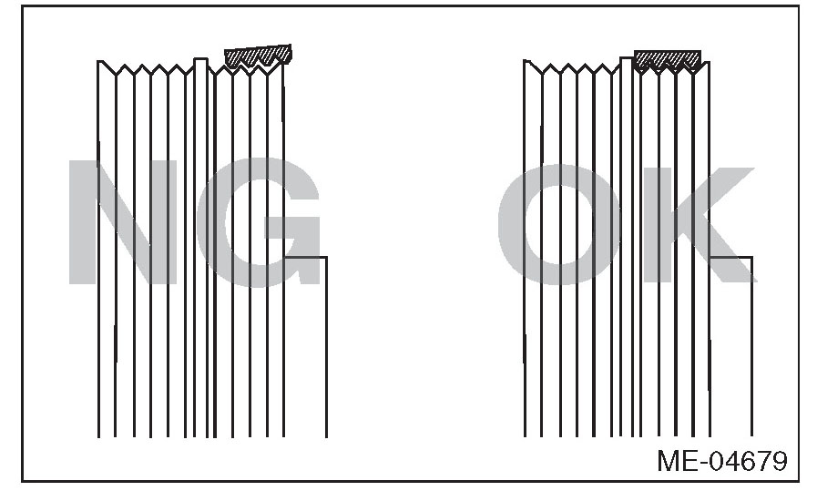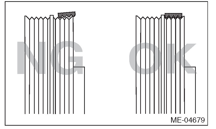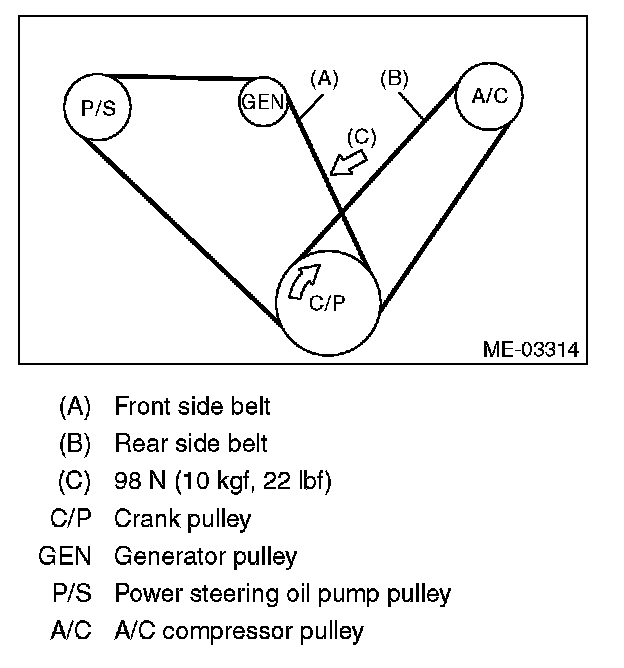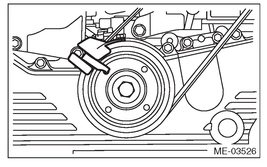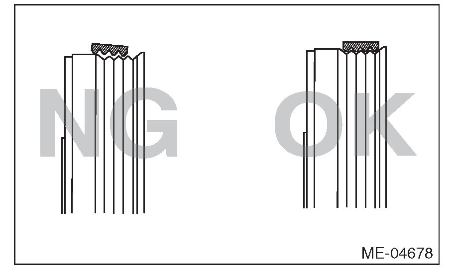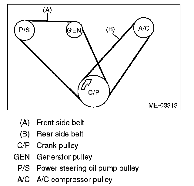^ If the front side belt tension is lower, the front side belt and crank pulley slip, causing abnormally high temperature on the crank pulley due to frictional heat. If this condition repeatedly occurs, the front side belt may abnormally wear, causing abnormal noise, front side belt damage or crank pulley damage.