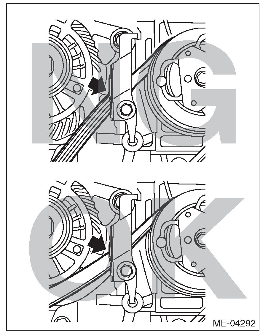 9) Place the rib surface of the rear side belt into the crank pulley groove, so that the rear side belt comes in between the belt guide holder.