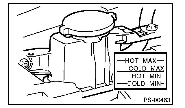 (2) Check at power steering fluid temperature 80°C (176°F); read the fluid level on the "HOT" side.
