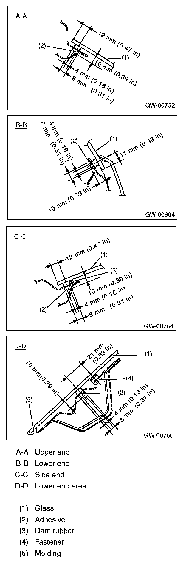 2. Because the lower end of the molding can become removed easily, affix the contact surfaces of the glass and molding with an adhesive agent.