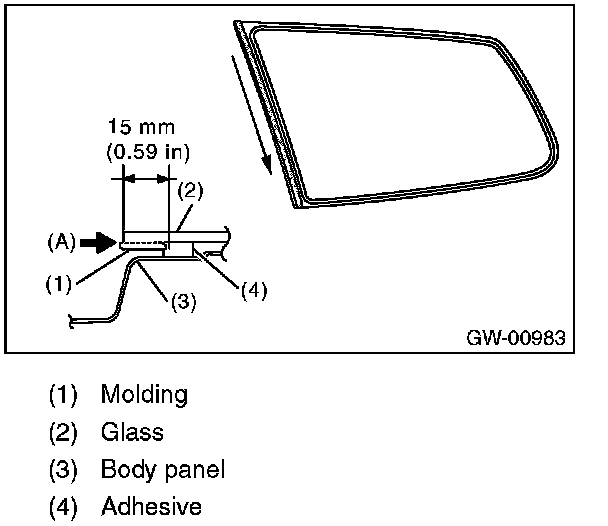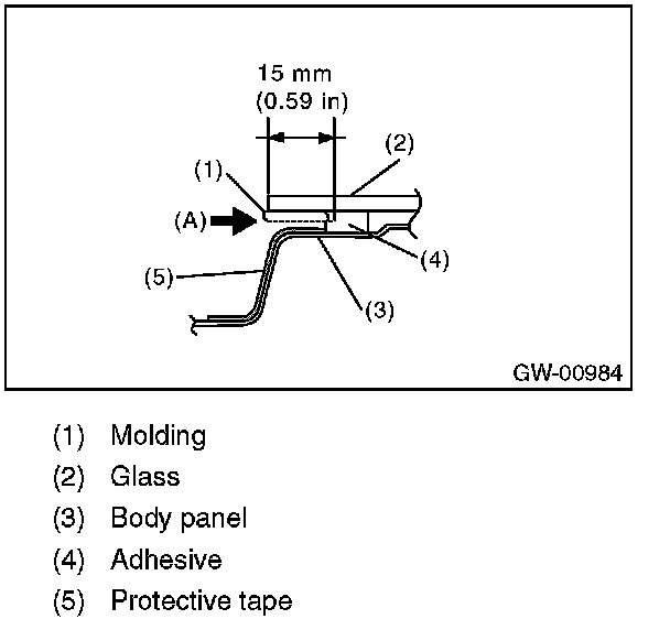 7. Make a slit approximately for 15 mm (0.59 in) to the adhesive surface between molding and glass (arrow position (A)) using a cutter.
