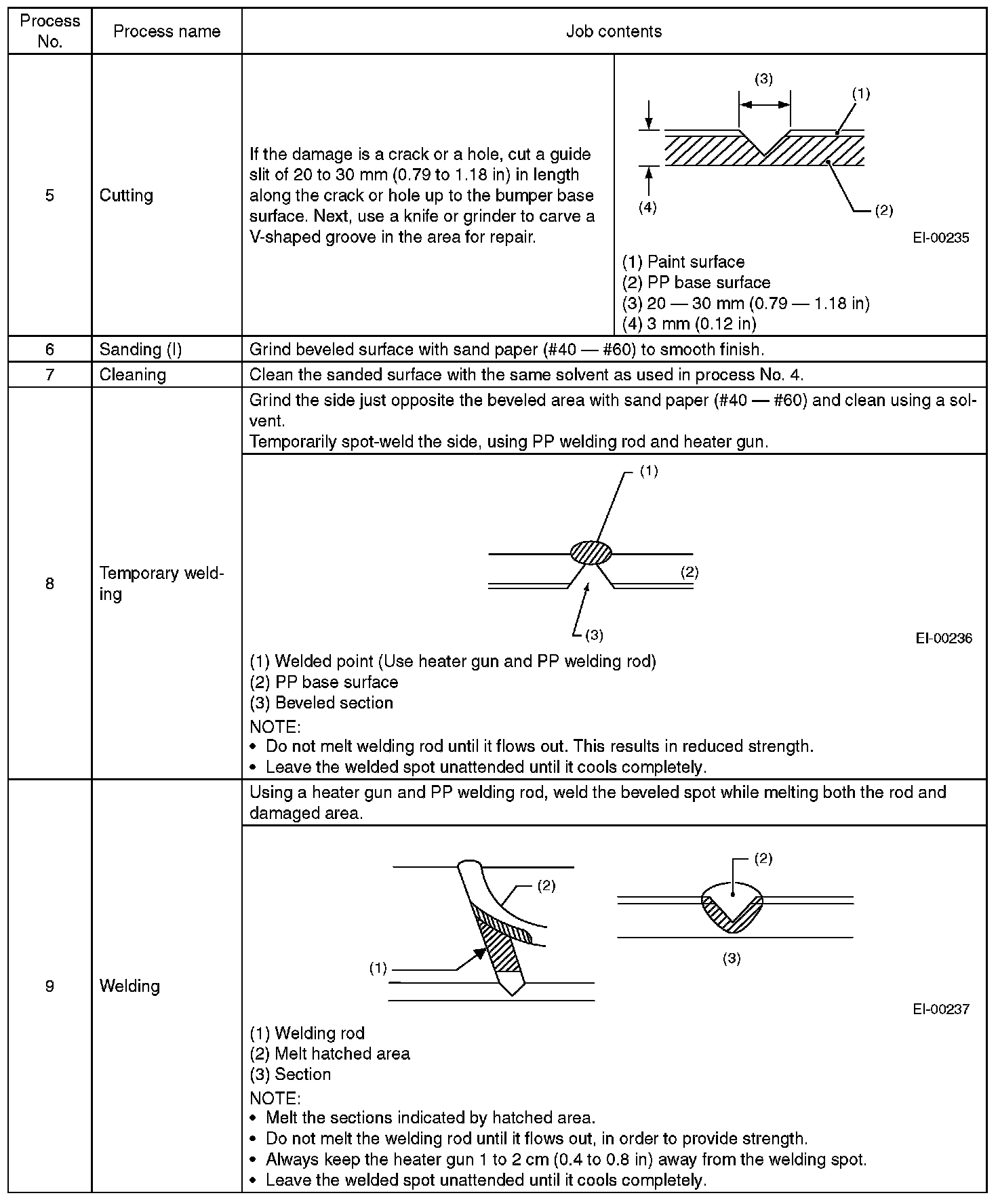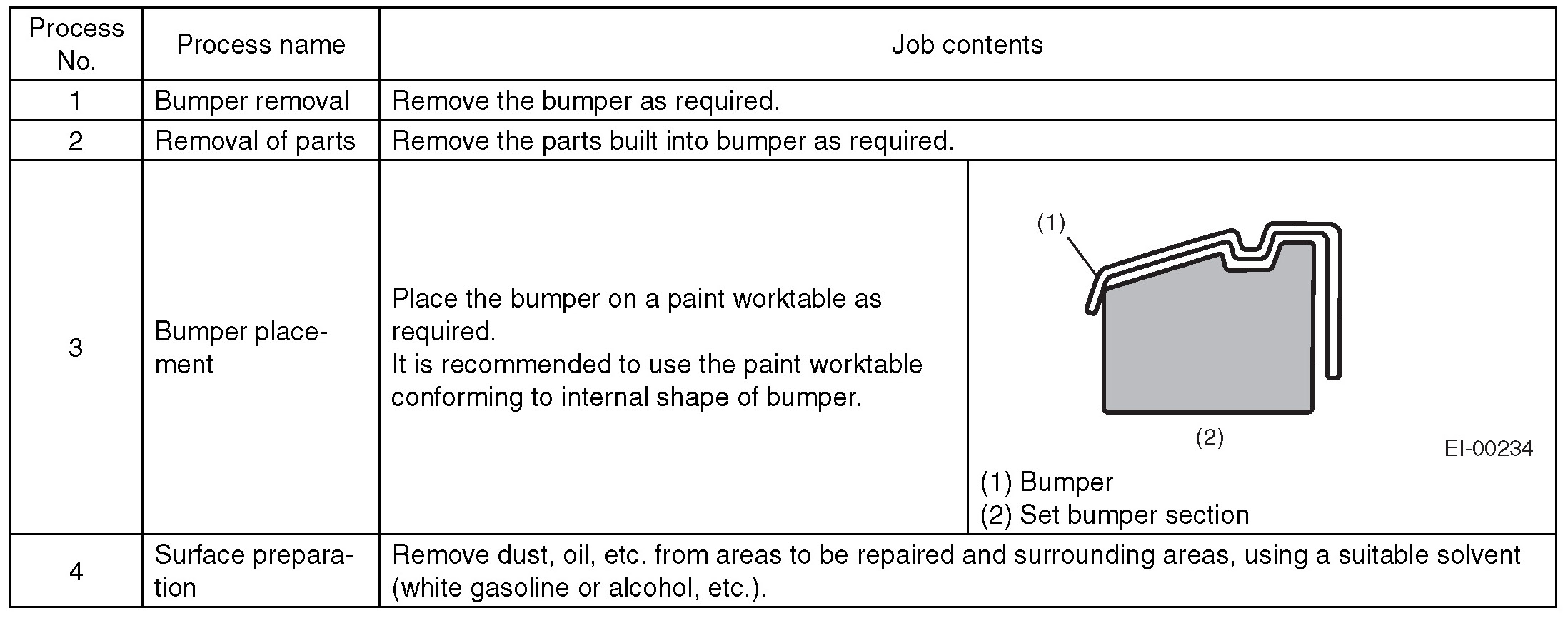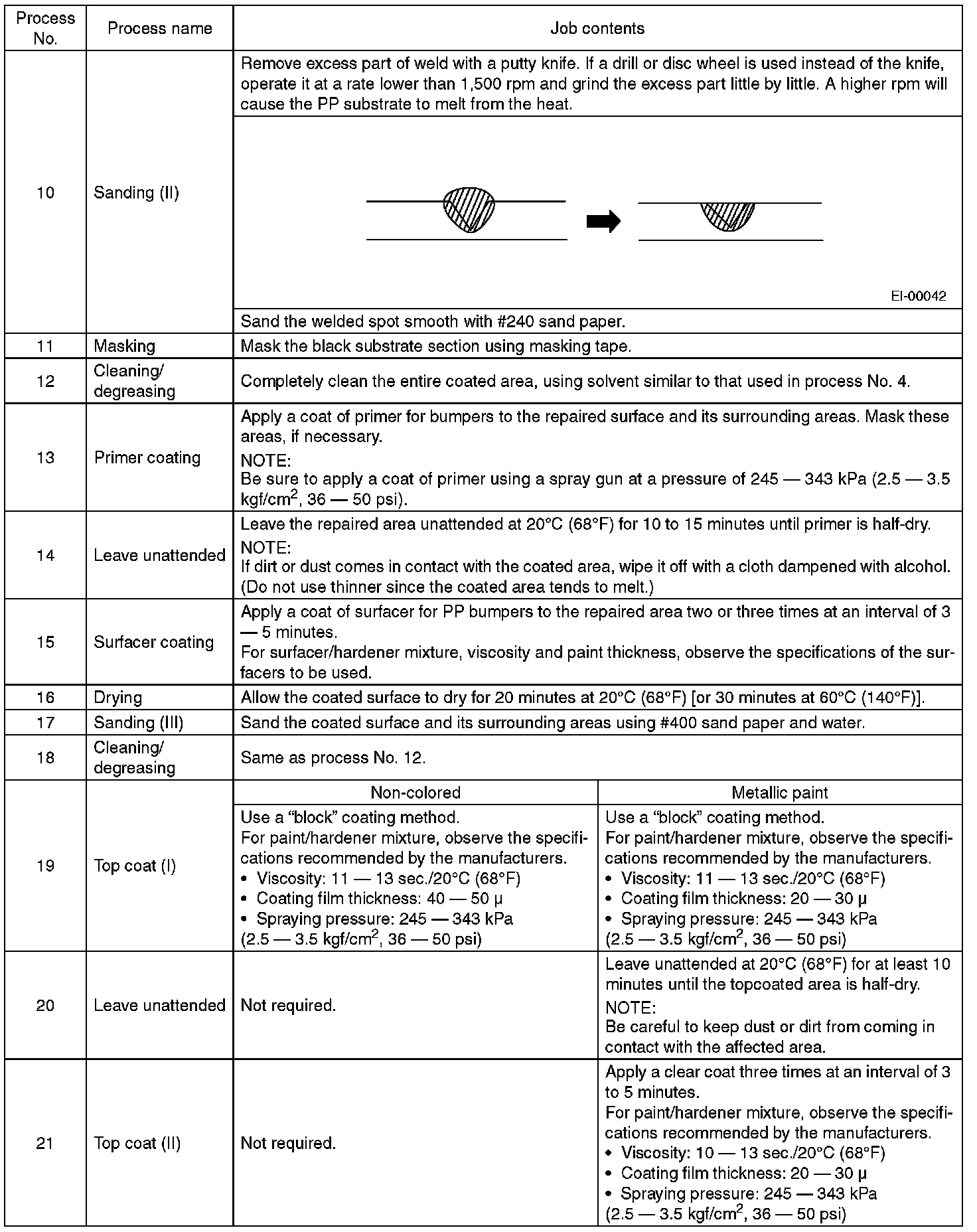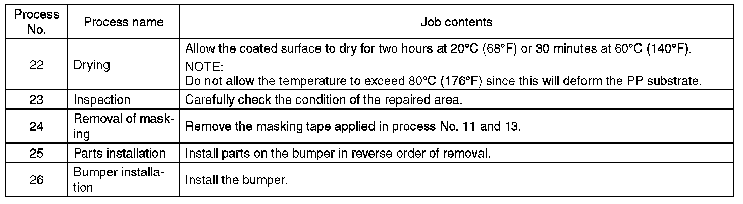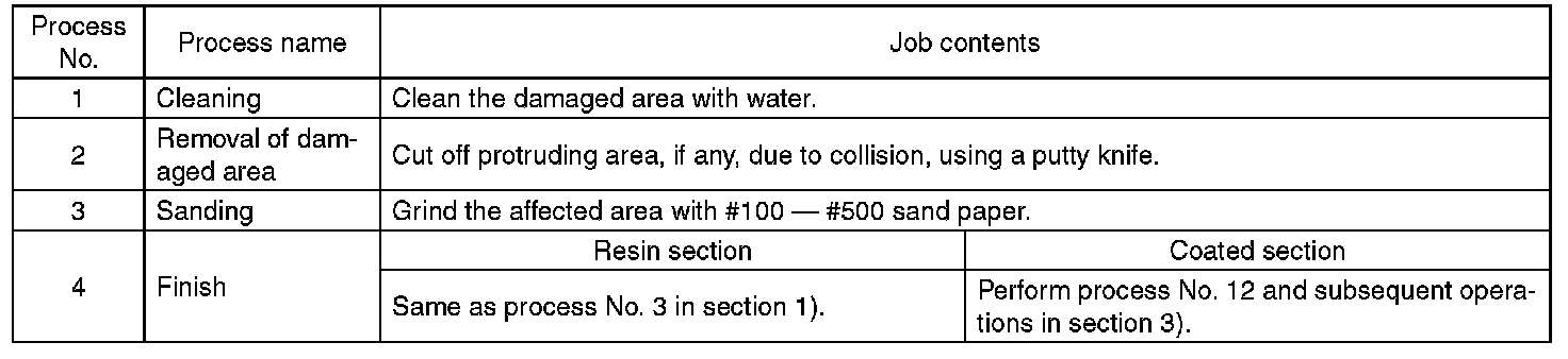 NOTE: All PP bumpers are provided with a grained surface, and if the surface is damaged, it cannot normally be restored to its former condition. Damages limited to the shallow scratches that cause only a change in the luster of the base material or coating, can be almost fully restored. Before repairing a damaged area, explain this point to the customer and obtain an understanding about the matter.