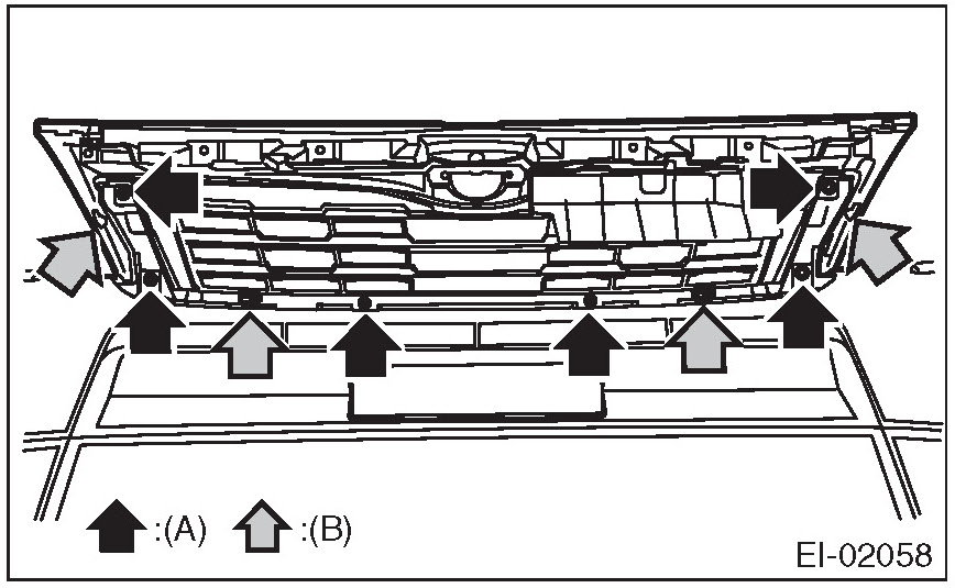 3. Detach the tabs (B) and remove the front grille assembly.