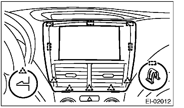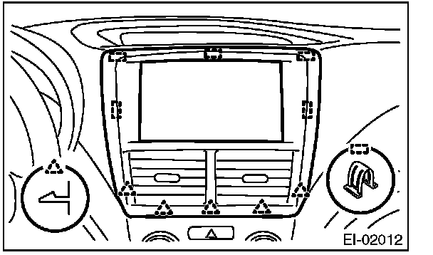 8. Detach the screws and the plastic hooks to remove the ornament panel RH.