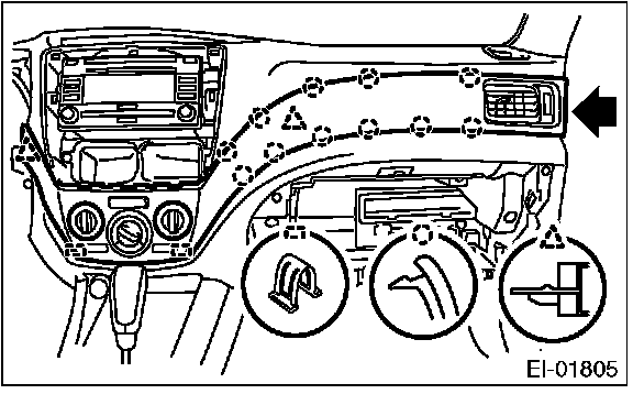 5. Detach the plastic hooks (A) and remove the instrument panel side cover RH.