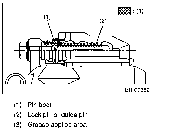7) Apply grease contained in the piston seal kit to the lock pin, guide pin outer surface, cylinder inner surface, and boot grooves.
