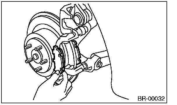 ^ A wear indicator is installed on the inner disc brake pad. If the pad is worn to the limit, the end of wear indicator contacts disc rotor, and a squeaking sound is heard as the wheel rotates. If the sound is heard, replace the pad.