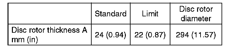 4) Set a micrometer 10 mm (0.39 in) inward from the disc rotor outer perimeter, and then measure the disc rotor thickness. If the disc rotor thickness (A) exceeds the service limit, replace with a new disc rotor.