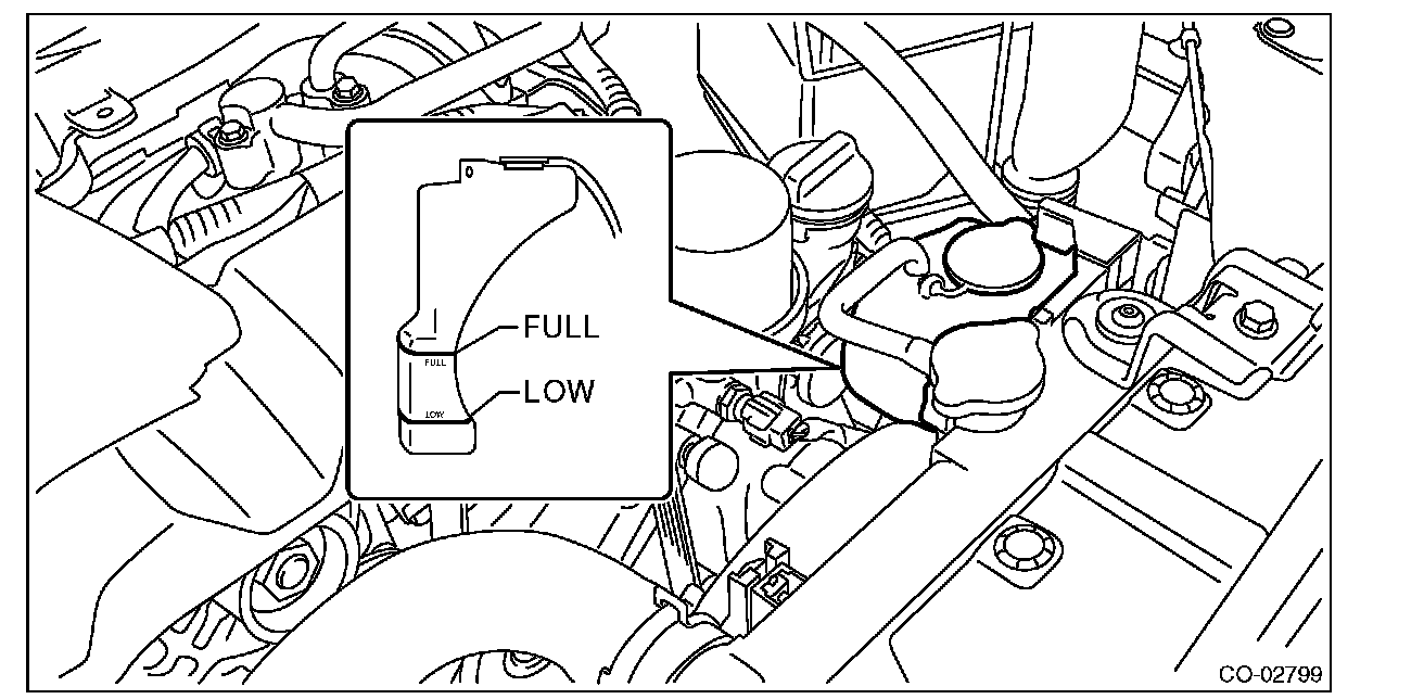 3) Fill engine coolant into the reservoir tank up to "FULL" level.