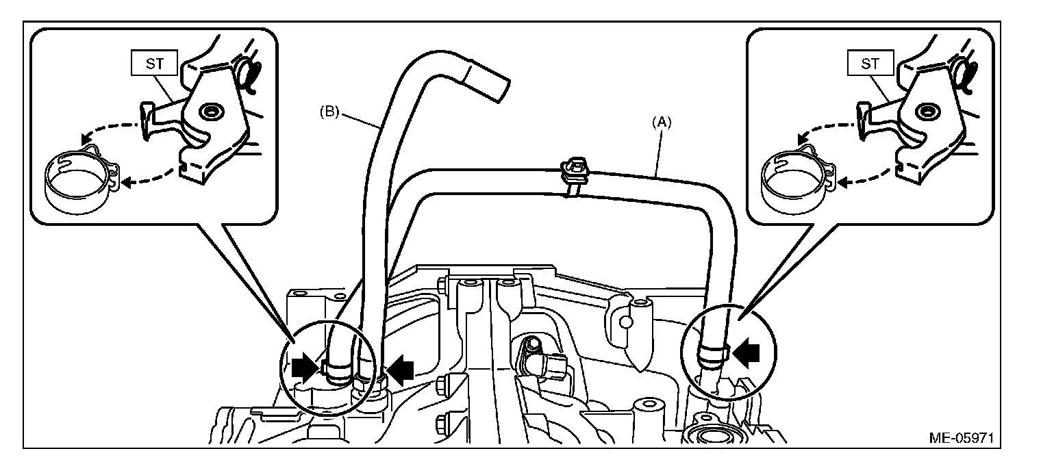 Pinch the clamp of the PCV hose assembly (A) by fitting the cut out in the ST with the protrusion on the clamp as shown in the figure, and unlock the clamp.