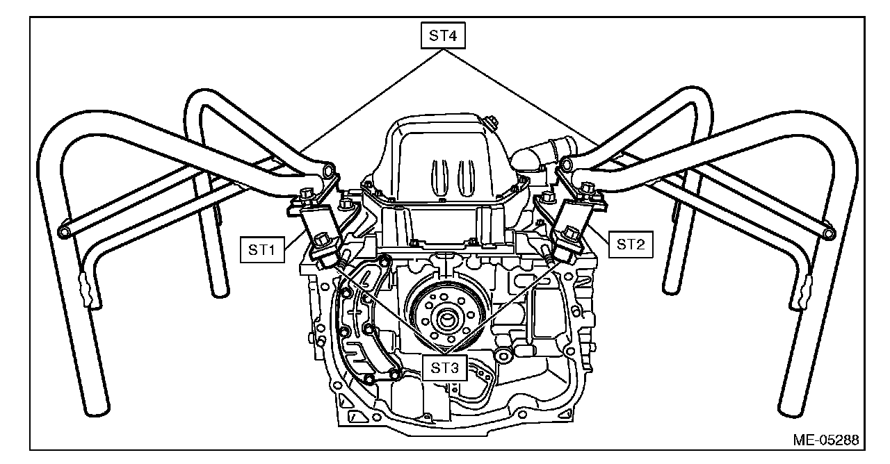 19) Set the cylinder block so that the oil pan is on the upper side, remove the ST1, ST2, ST3 and ST4 from cylinder block and oil pan upper.