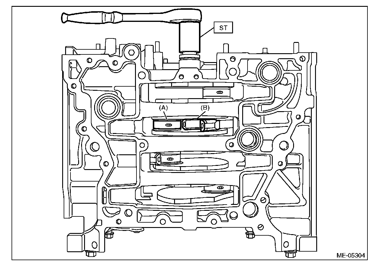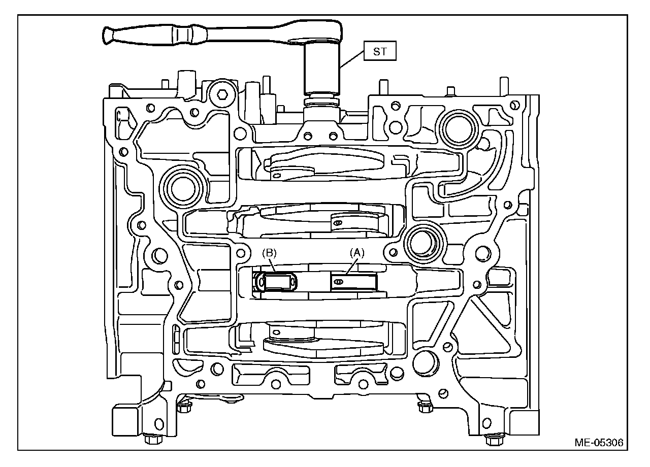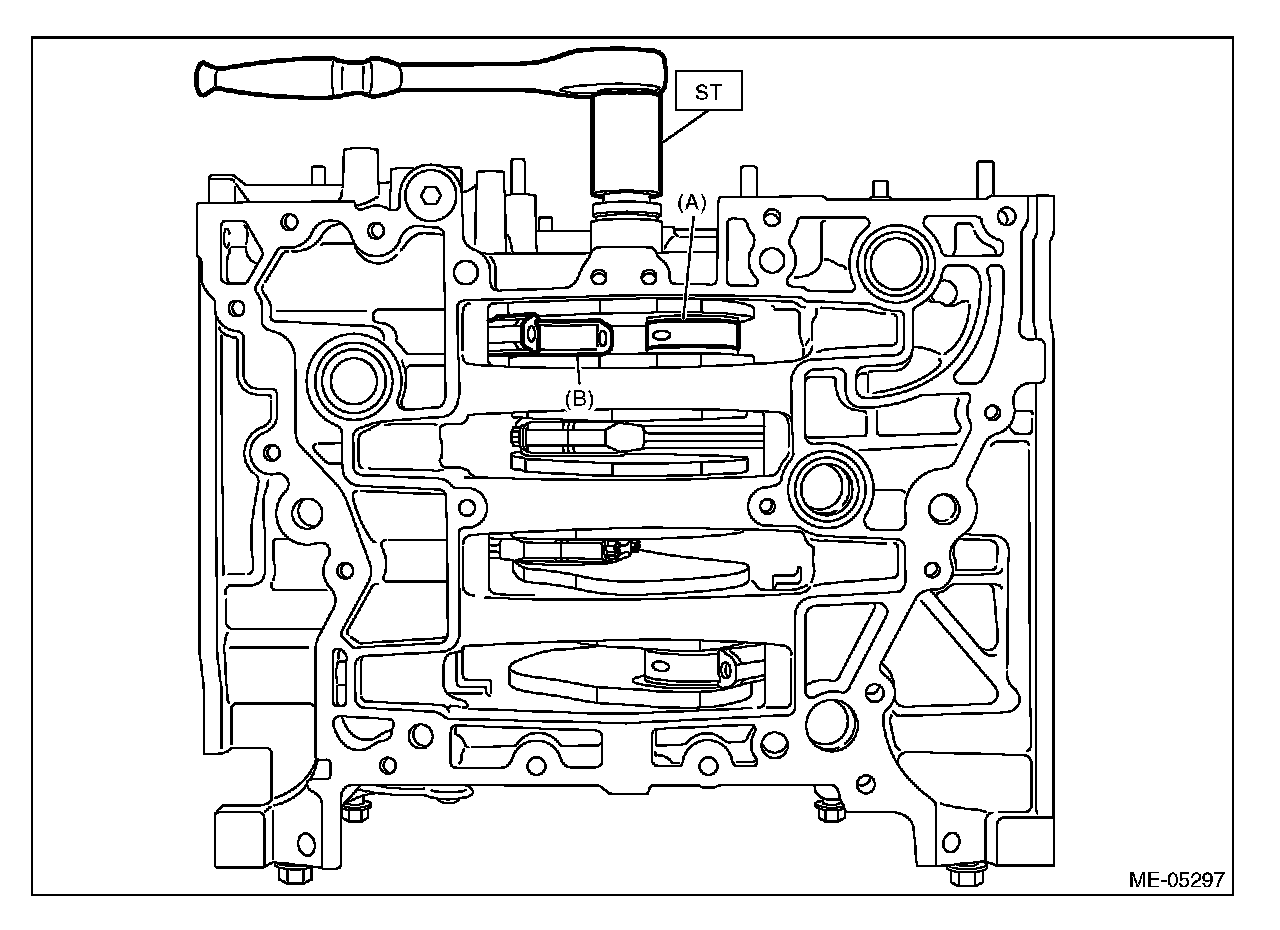 (1) Turn the crankshaft so that the #2 connecting rod cap (A) and #3 connecting rod cap (B) is located at the position shown in the figure using ST.