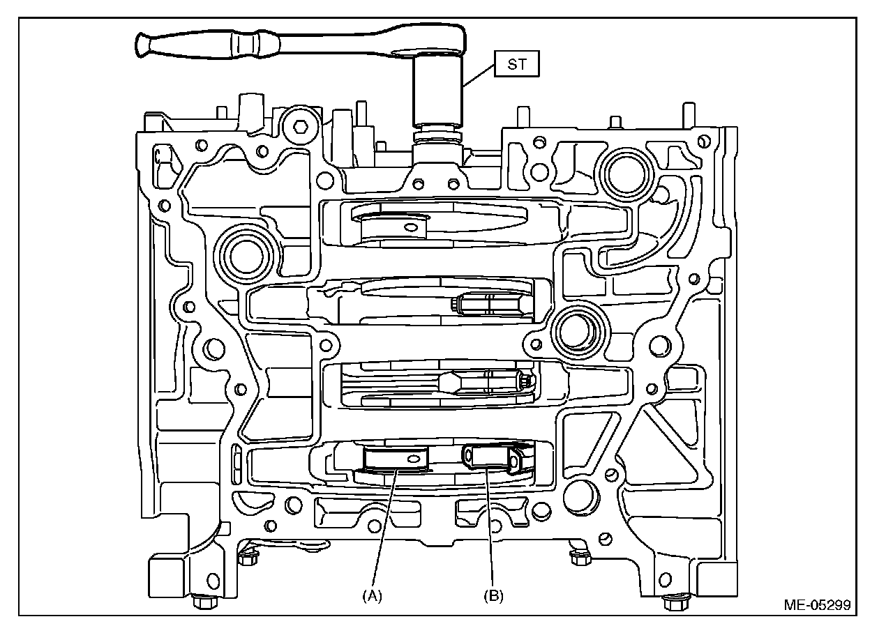 (1) Turn the crankshaft so that the #1 connecting rod cap (A) and #4 connecting rod cap (B) is located at the position shown in the figure using ST.