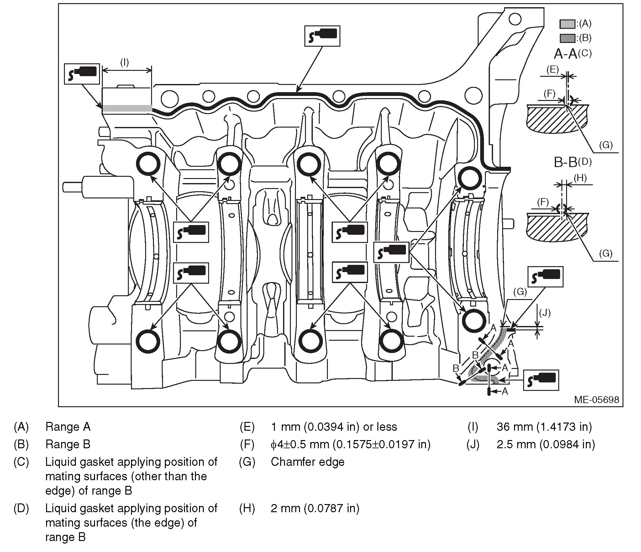 After tightening, if the liquid gasket is squeezed out in the seal surface area of the chain cover and oil pan upper, completely remove any liquid gasket that is squeezed out. Any liquid gasket on the chamfer area, however, should not be removed.