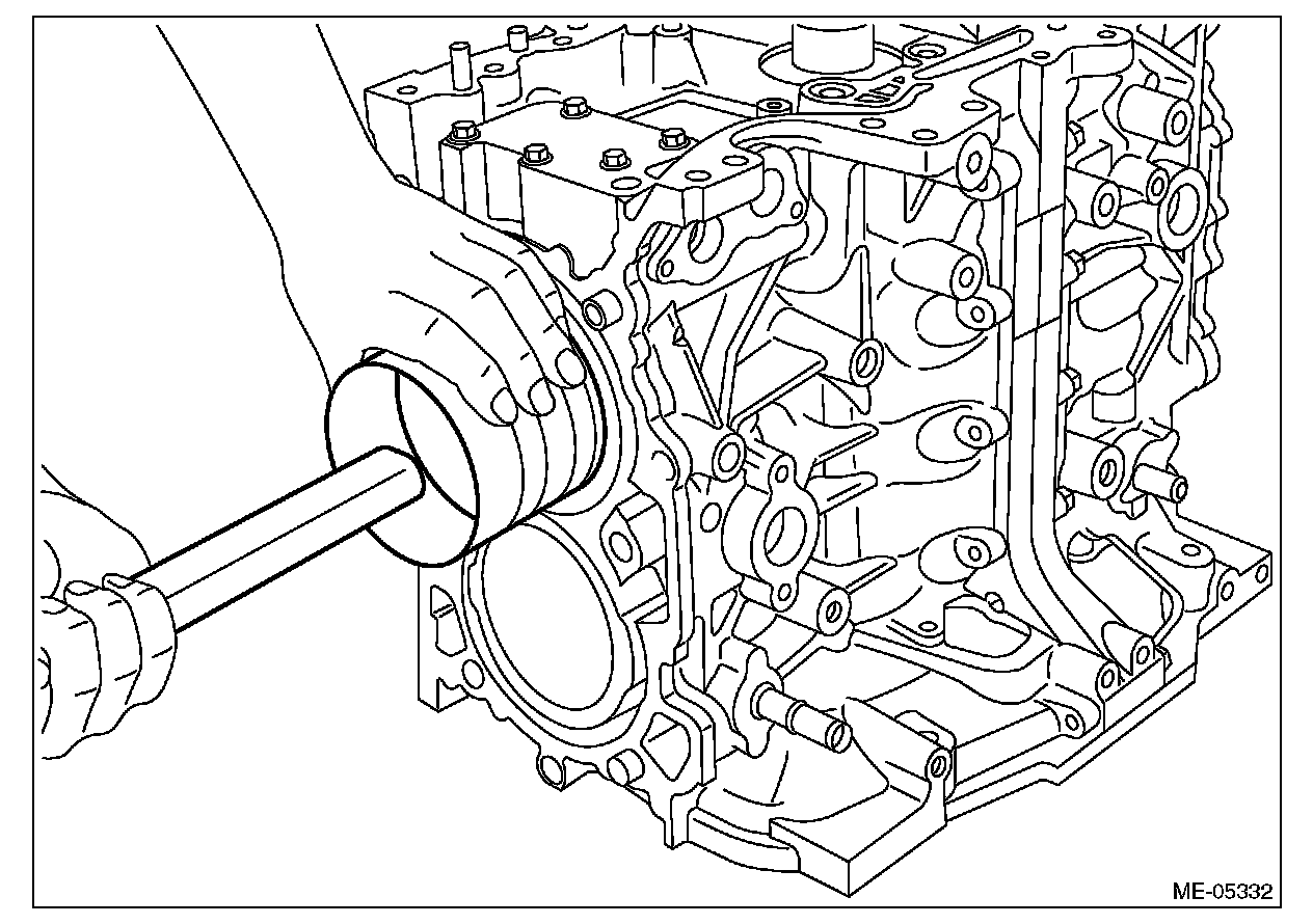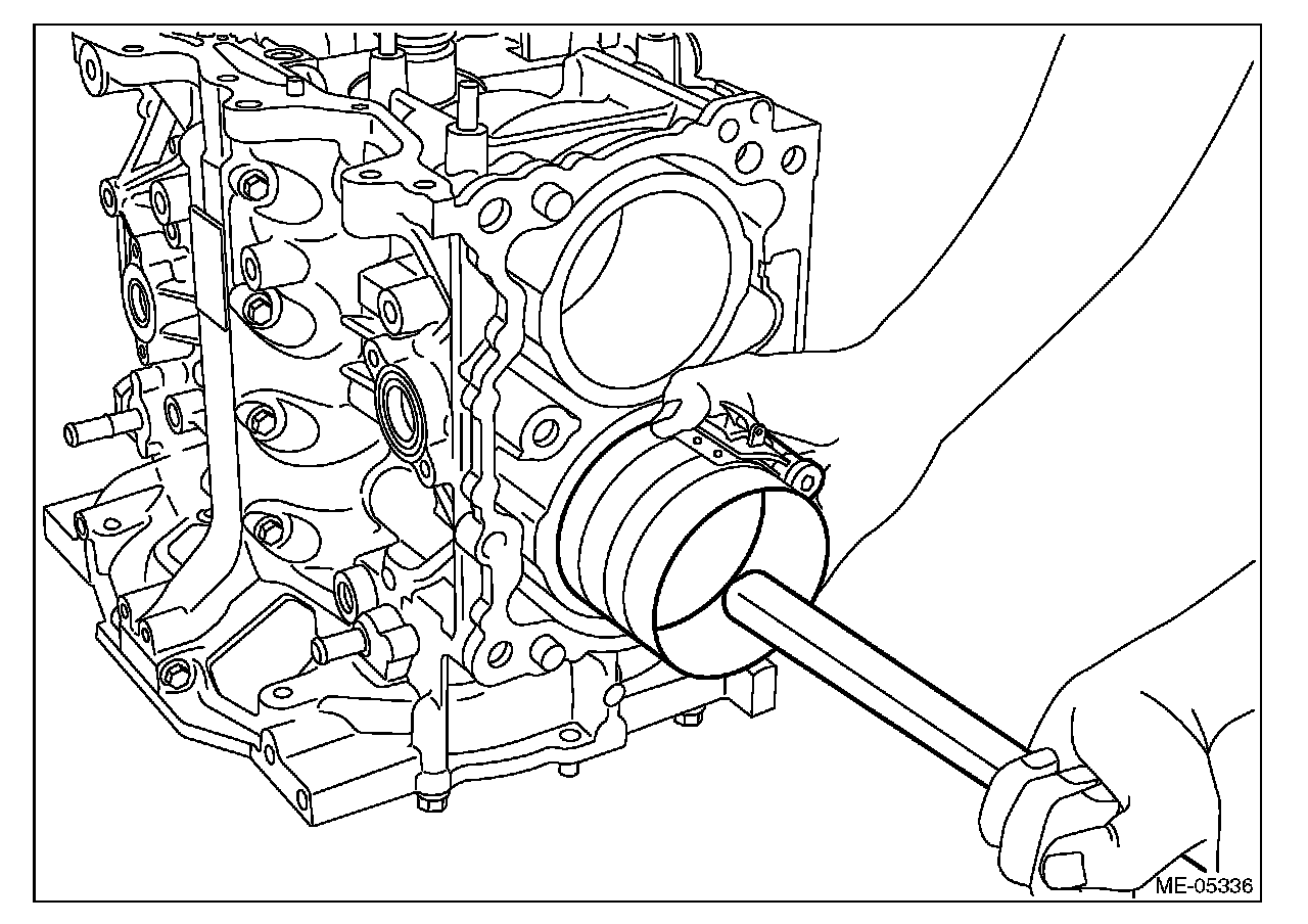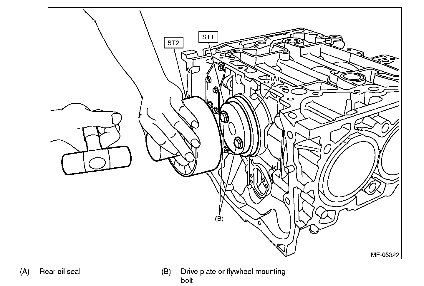 Cylinder Block (Continued)8) Apply a coat of engine oil to the oil seal inner periphery and outer periphery, and install the rear oil seal using ST1 and ST2.