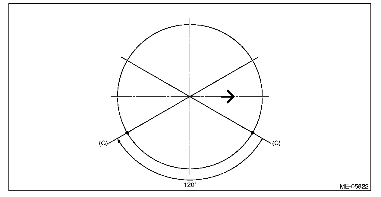 (6) Set the ring gap of lower rail at position (G), located 120° clockwise from (C) in the figure.