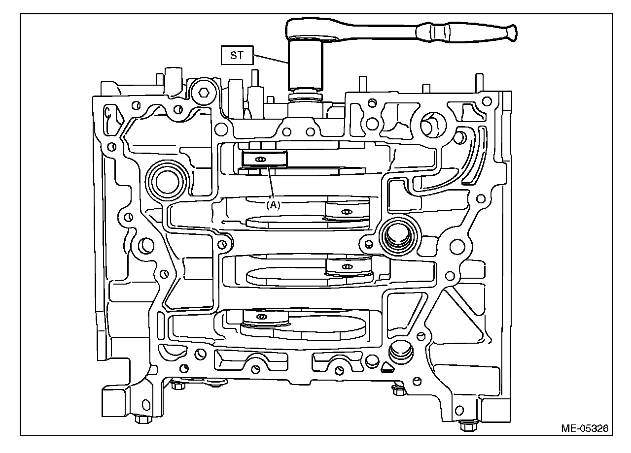 (16) Turn the crankshaft clockwise so that the #4 crank pin and the large end of #4 connecting rod (A) are positioned as shown in the figure using ST, while pressing the #4 piston crown, and then set the #4 connecting rod cap and #4 connecting rod cap bolt.