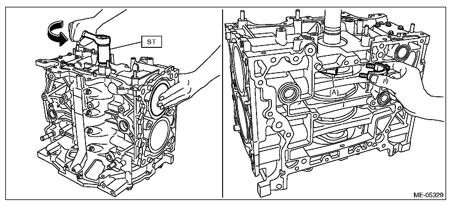 (10) Turn the crankshaft clockwise so that the #3 crank pin (A) is positioned at TDC using ST.