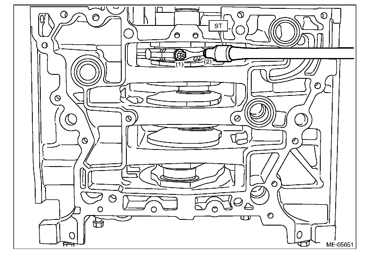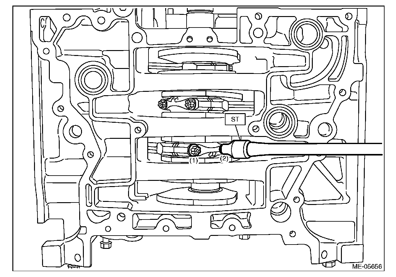 (5) Using ST, tighten the #1 connecting rod cap bolts to 10 Nm (1.0 kgf-m, 7.4 ft-lb) in numerical order as shown in the figure, then retighten the bolts to 22 Nm (2.2 kgf-m, 16.2 ft-lb) in numerical order as shown in the figure.
