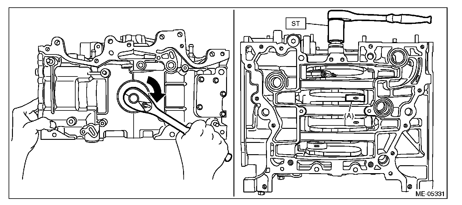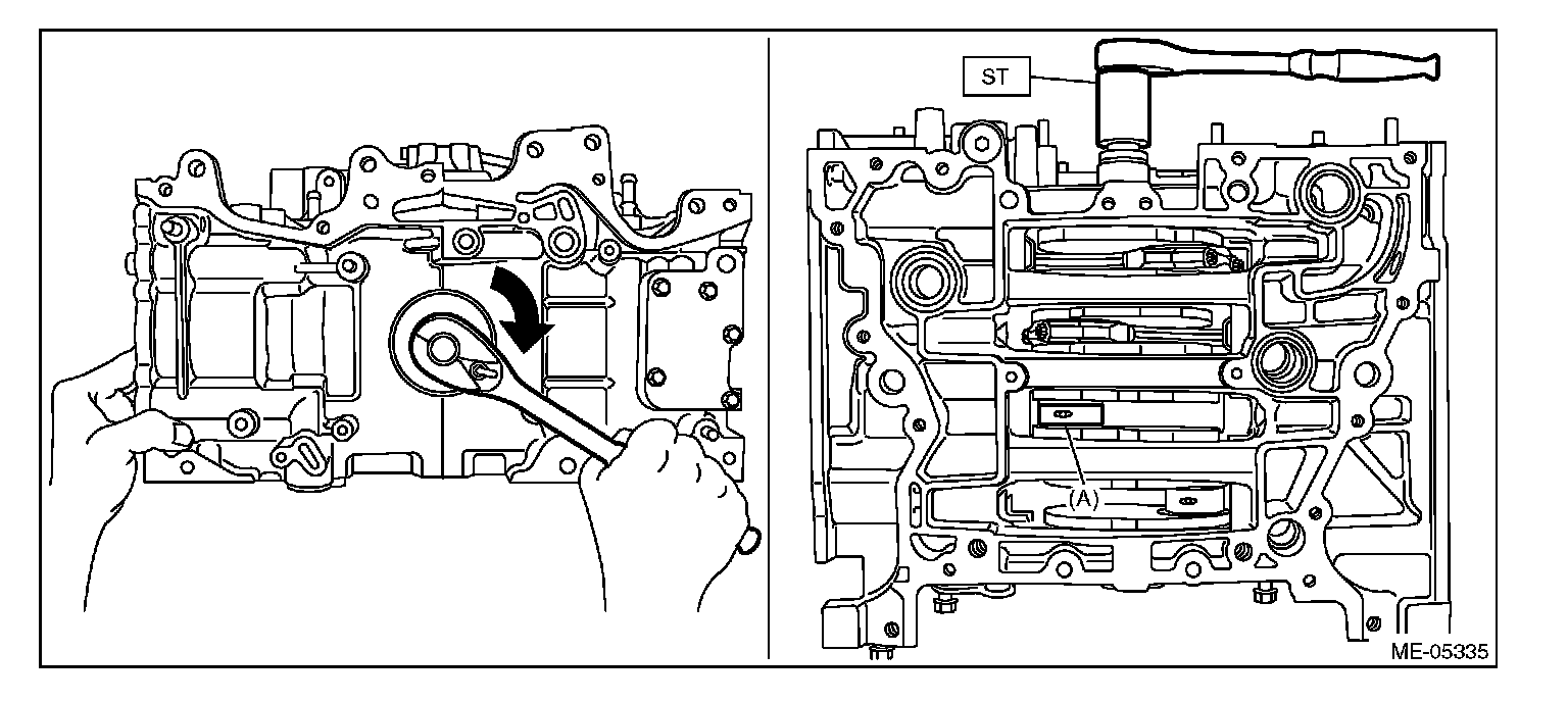(4) Turn the crankshaft counterclockwise so that the #1 crank pin and the large end of #1 connecting rod (A) are positioned as shown in the figure using ST, while pressing the #1 piston crown, and then set the #1 connecting rod cap and #1 connecting rod cap bolt.
