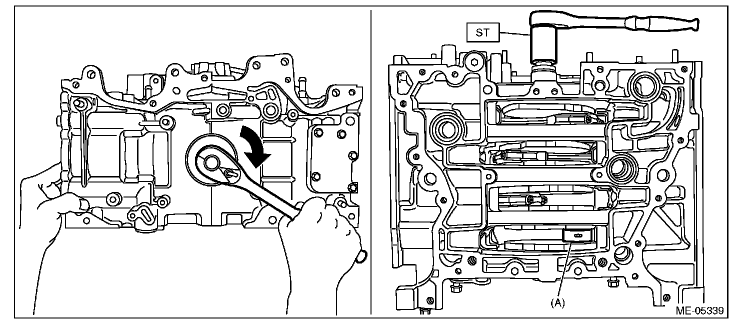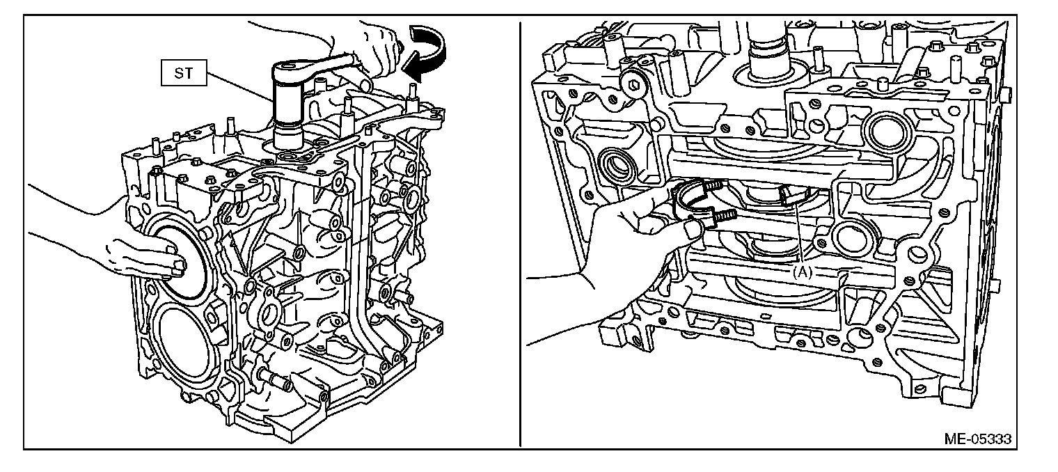 (12) Turn the crankshaft counterclockwise so that the #3 crank pin and the large end of #3 connecting rod (A) are positioned as shown in the figure using ST, while pressing the #3 piston crown, and then set the #3 connecting rod cap and #3 connecting rod cap bolt.
