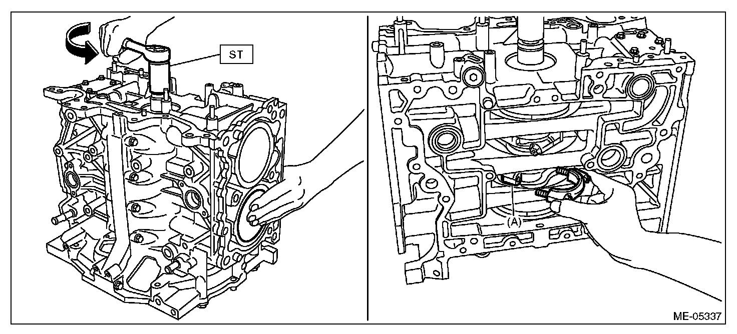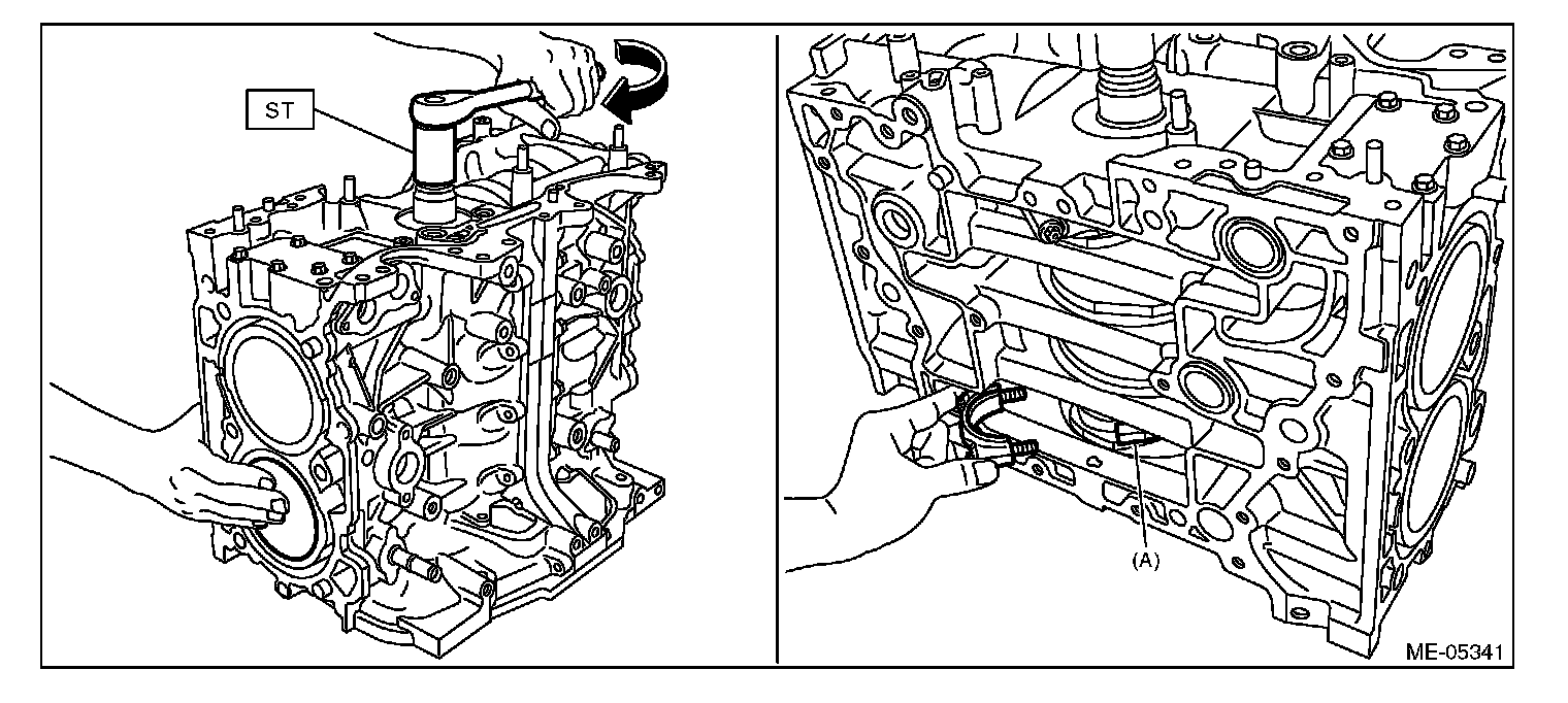 (8) Turn the crankshaft clockwise so that the #2 crank pin and the large end of #2 connecting rod (A) are positioned as shown in the figure using ST, while pressing the #2 piston crown, and then set the #2 connecting rod cap and #2 connecting rod cap bolt.