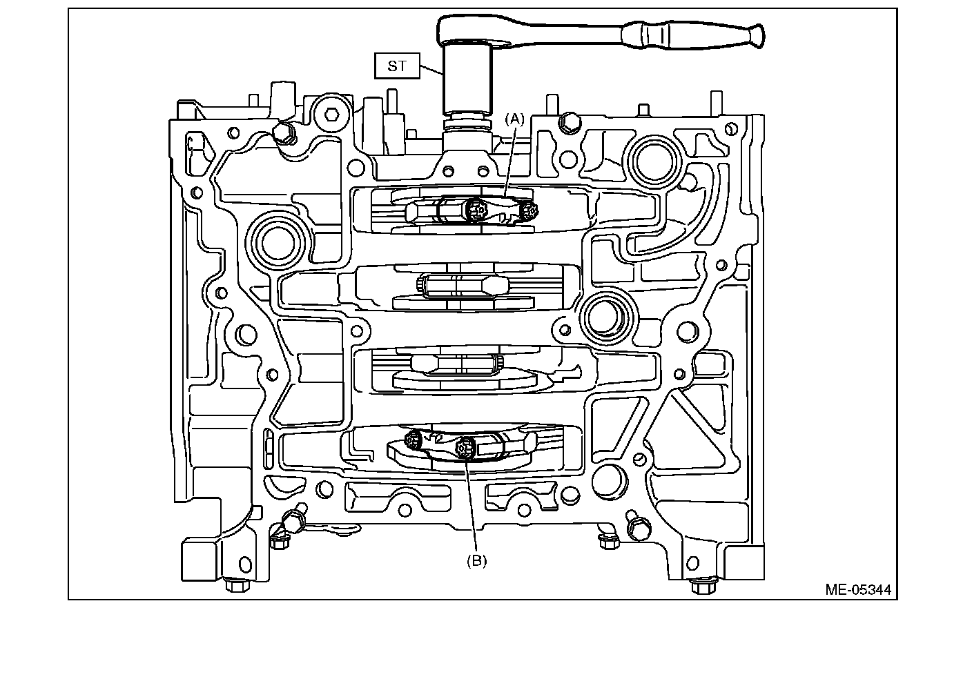 (19) Turn the crankshaft so that the #1 connecting rod cap (A) and #4 connecting rod cap (B) is located at the position shown in the figure using ST.