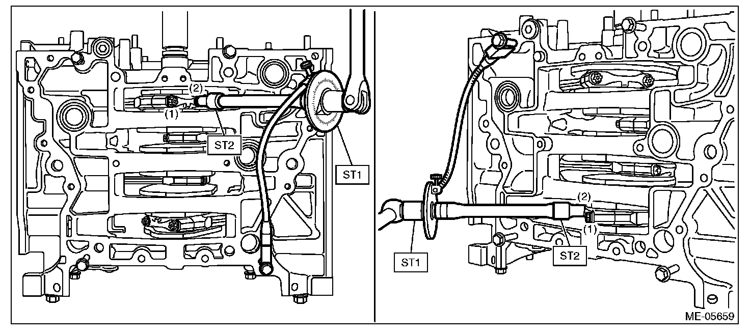 (20) Using ST1 and ST2, tighten the #1 connecting rod cap bolts and #4 connecting rod cap bolts with specified angle in numerical order as shown in the figure.