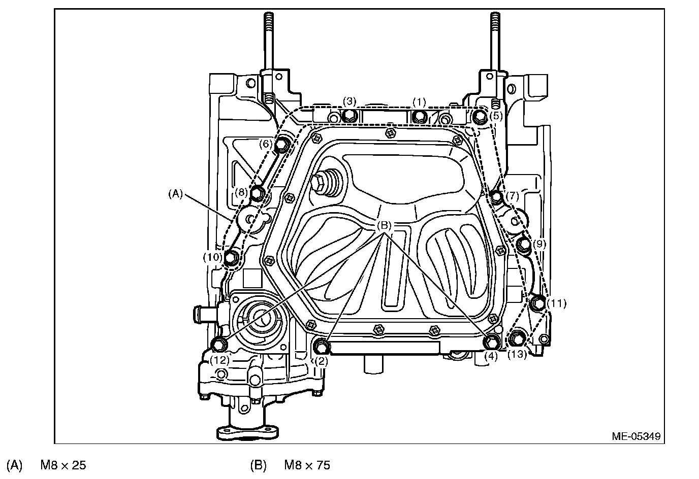 (3) Set the oil pan with oil pan upper to the cylinder block, and tighten the bolts in numerical order as shown in the figure.