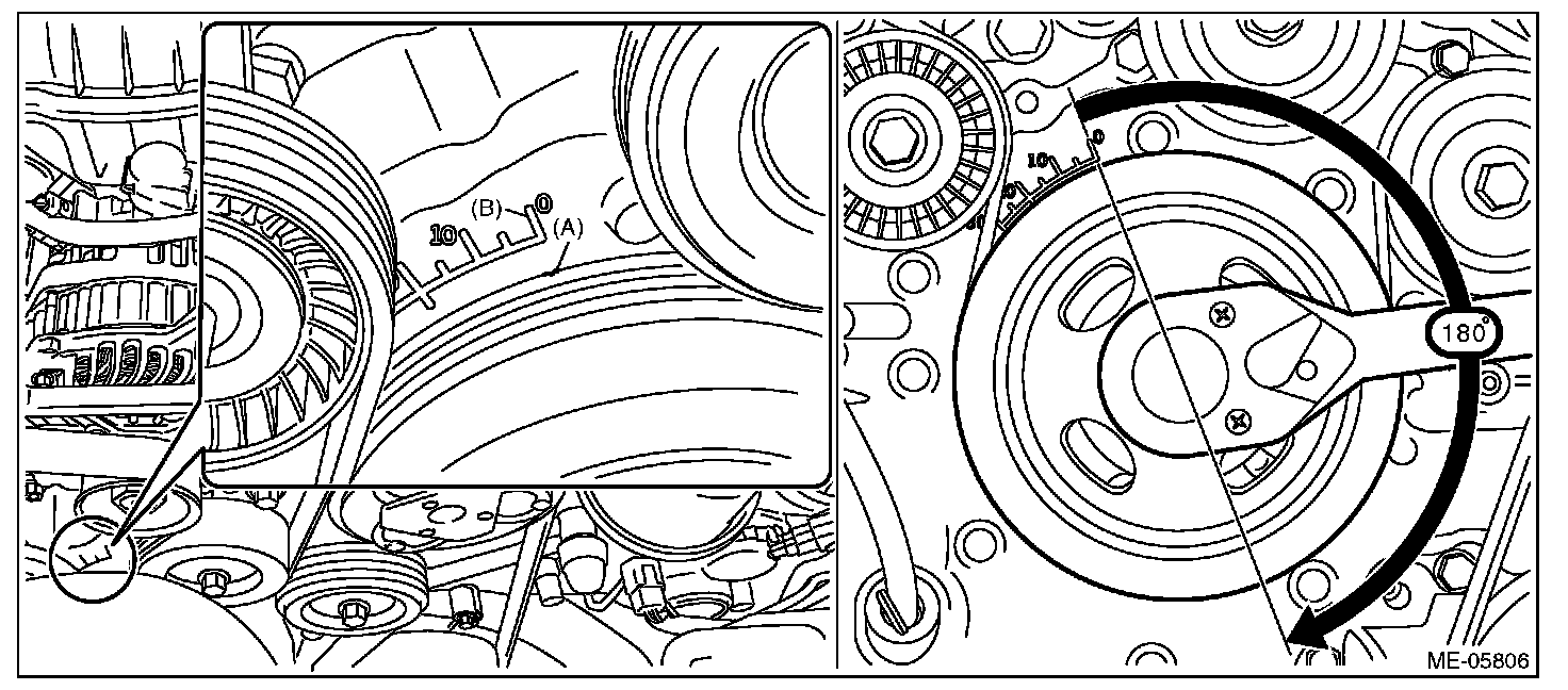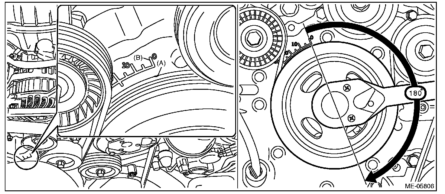 (4) Align the timing mark (A) of crank pulley to the timing gauge (B) 0° of chain cover as shown in the figure, and turn the crankshaft by 180° clockwise from that position.