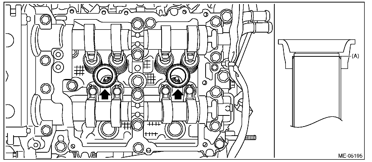 ^ Apply a light coat of engine oil to the #2 spark plug pipe gasket and #4 spark plug pipe gasket, and insert them onto the spark plug pipe edge (A).