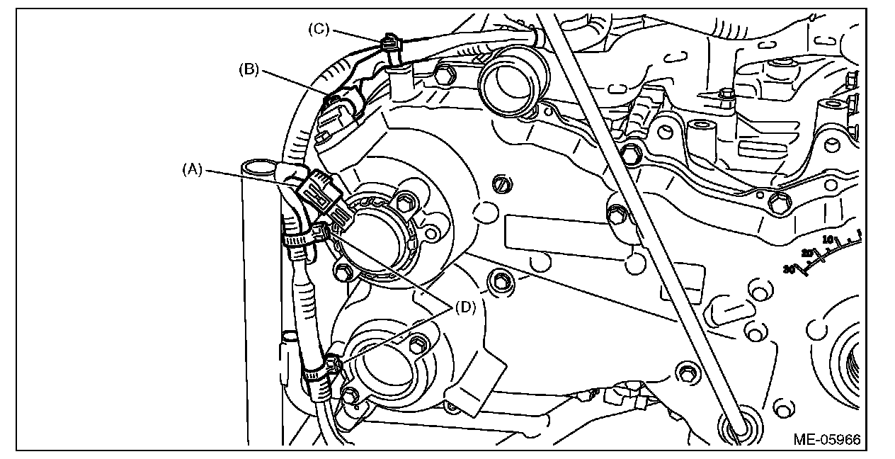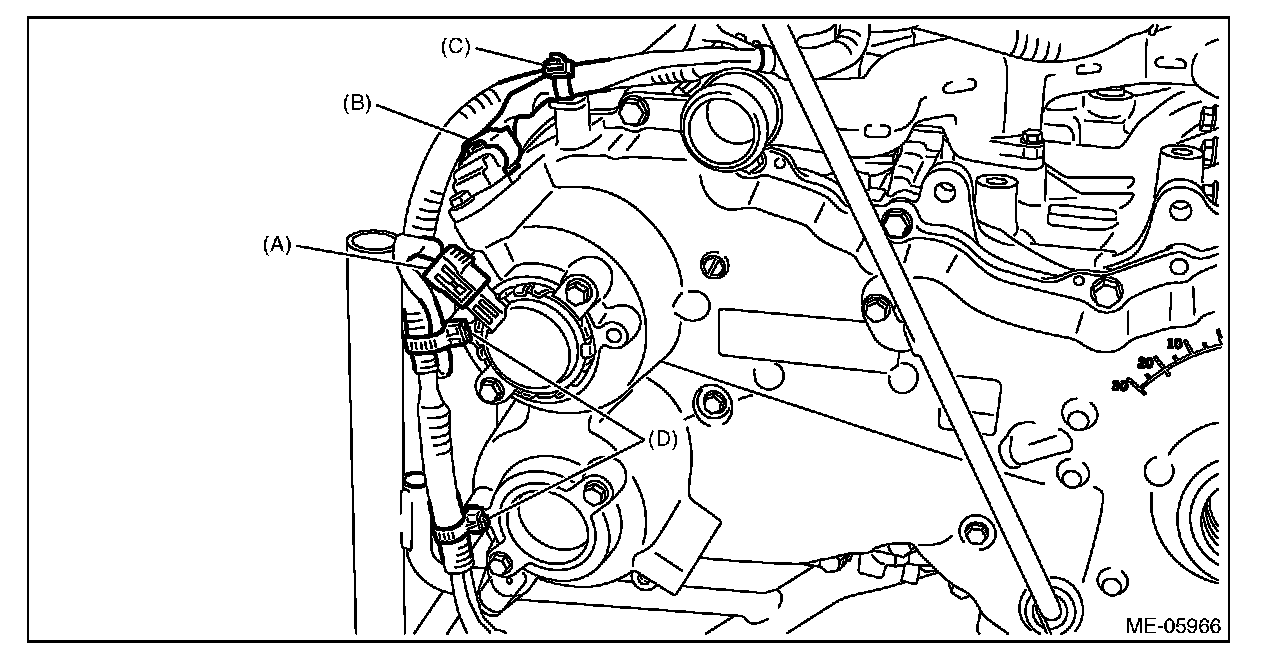 6) Disconnect the connector (A) from the oil control solenoid RH, and the connector (B) from the camshaft position sensor RH, and remove the clip (C) and clip (D) which secure the engine harness.